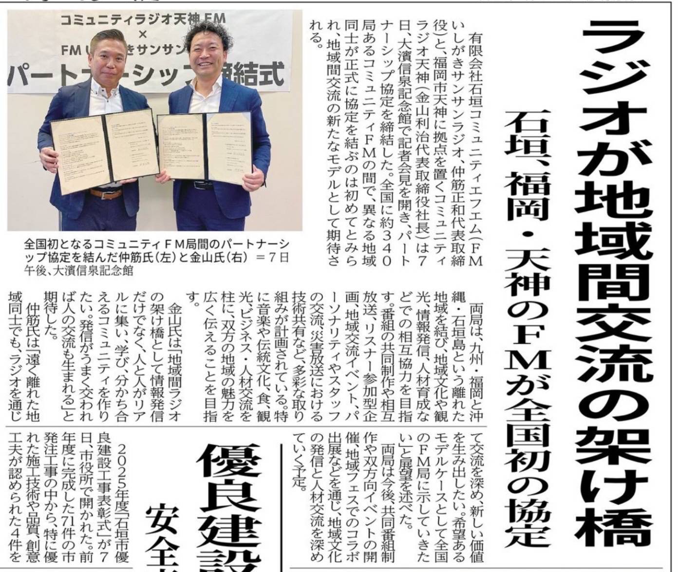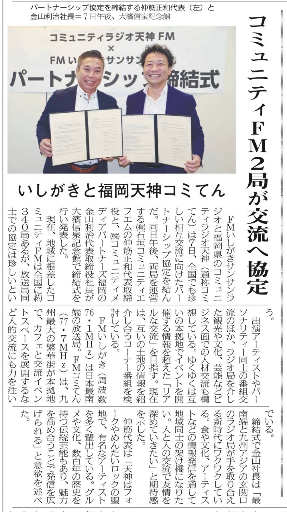 2025年10月7日、コミュニティラジオ天神は、石垣島のFMいしがきサンサンラジオとパートナーシップ協定を締結いたしました。
